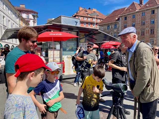 Von der Herz-Jesu-Kirche, wo, dank Prof. Pfeifhofers fantastischem Fernrohr, der Blick auf gefährdete Gebäudebrüter wie Mauersegler, Rauch- und Mehlschwalben und sogar Turmfalken erhascht werden konnte, führte uns der Weg zunächst zur Heilandskirche, dann bis zum Rathaus am Hauptplatz. Direkt an dessen Fassade finden sich die Nester der größten Mehlschwalbenpopulation der Steiermark.