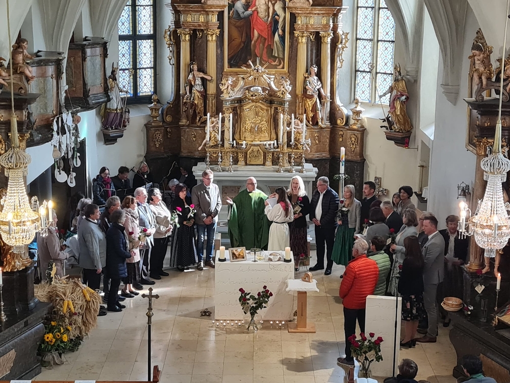 Nach dem feierlichen Einzug fand die Erntedankkrone, dieses liebevoll geschmückte Symbol reicher Ernte, vor dem Altar ihren Ehrenplatz. Danke der Landjugend Zettling für diese schöne Tradition!