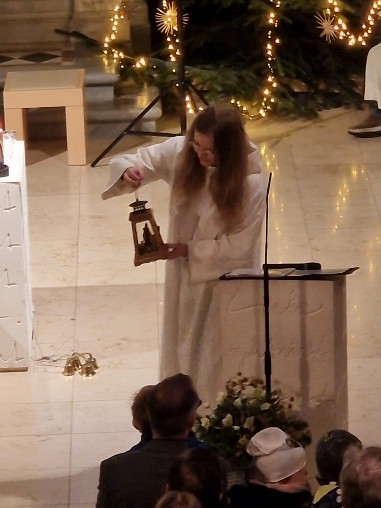 In seiner Predigt sprach Vikar Gerhard von Gott, der als kleines, hilfloses Kind zur Welt gekommen ist, in Armut und Bedürftigkeit. Eine mitgebrachte Windel symbolisiert dies. - Gott ist einer von uns, er kommt uns entgegen. Er ist ein Gott, an den wir uns anlehnen können. Er umarmt uns und stillt unser Verlangen nach Geborgenheit, Liebe und Frieden. …